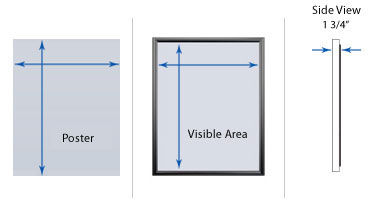 Quick-Changing Front Loading frame allows for effortless graphic and bulb replacement Narrow profile offers 1 3/4" overall off the wall depth Visible Area: Moulding overlaps poster 1/4" all around Highly reflective mirrored - aluminum backing board Cool white LEDs Window: .030 Clear Polycarbonate provides a clear view window Installs Easily, Mounting hardware included